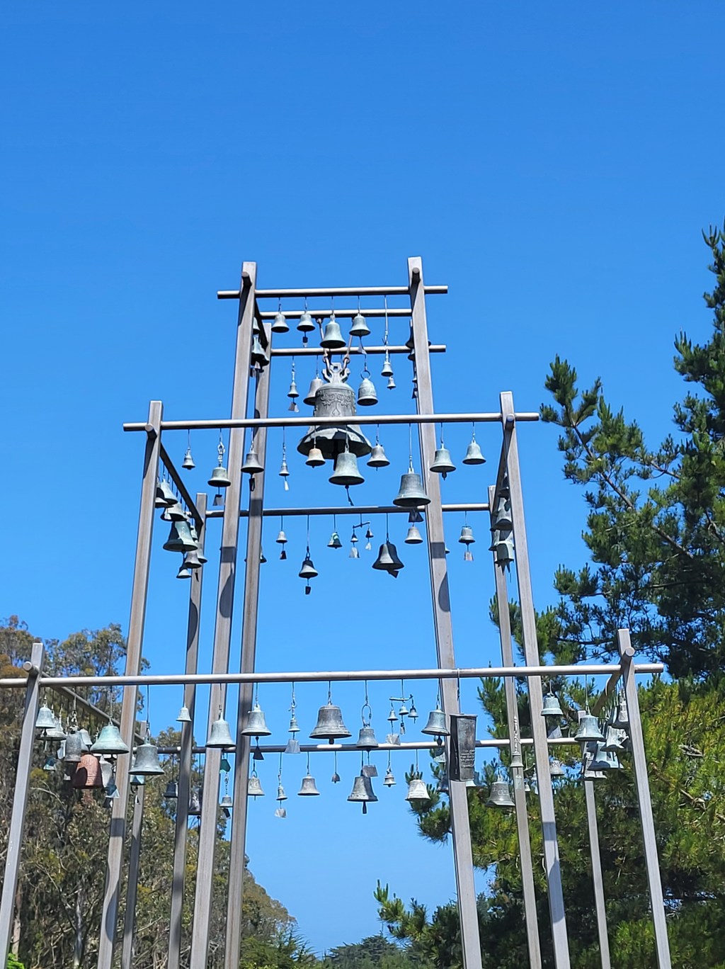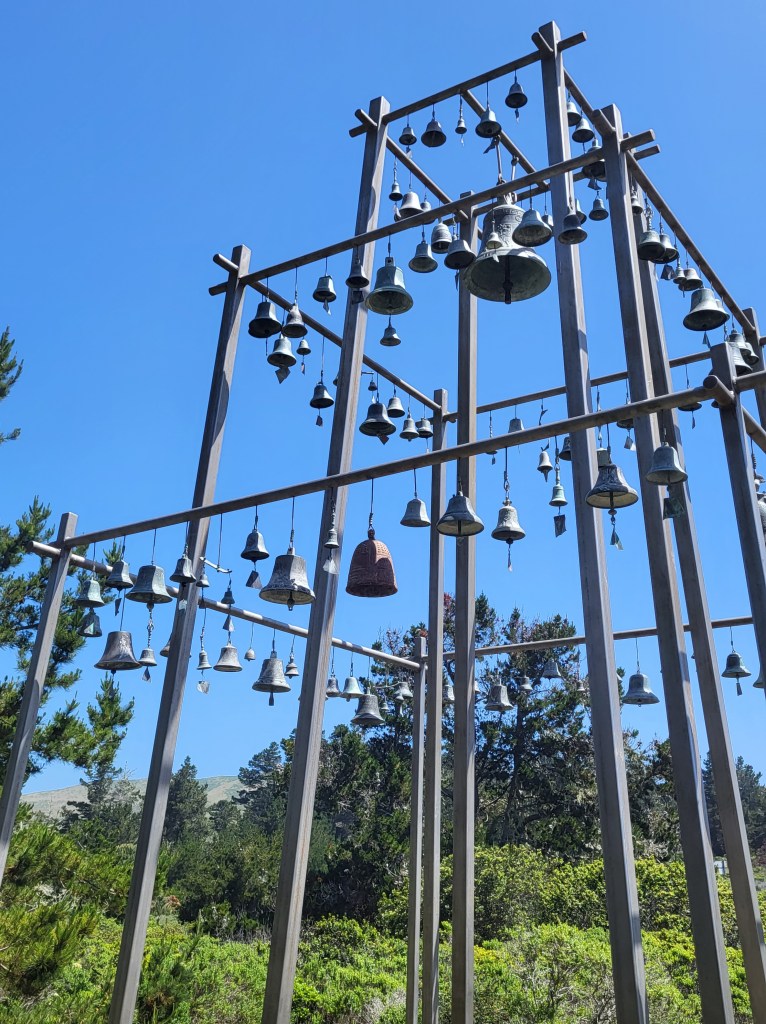 Located in an open field just a few steps after the parking area behind the Bodega Bay Community Center, the Children’s Bell Tower is an 18 feet high three-tier pyramid from which 140 bells hang.