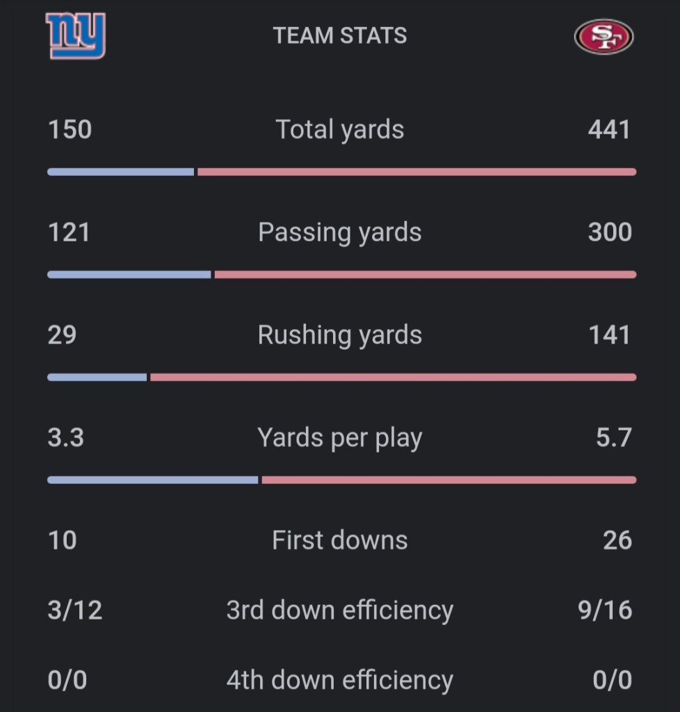 Although the Giants put up a resilient effort despite missing starting running back Saquon Barkley (ankle injury) and a few other starters, the 49ers proved to be too much and dominated in just about every statistical category.