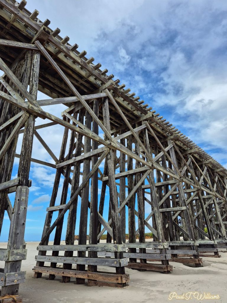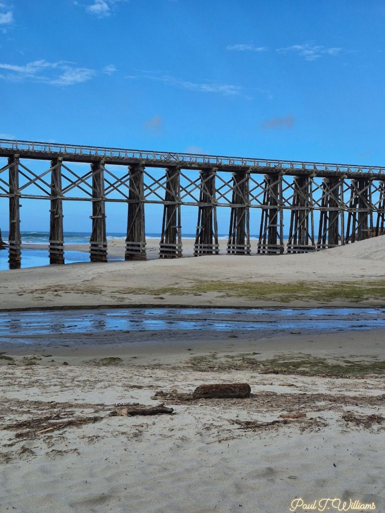 The beach is known for its wide sandy dunes, calm creek, and the old wooden Pudding Creek Trestle bridge that originally was used as a railroad until 1949.